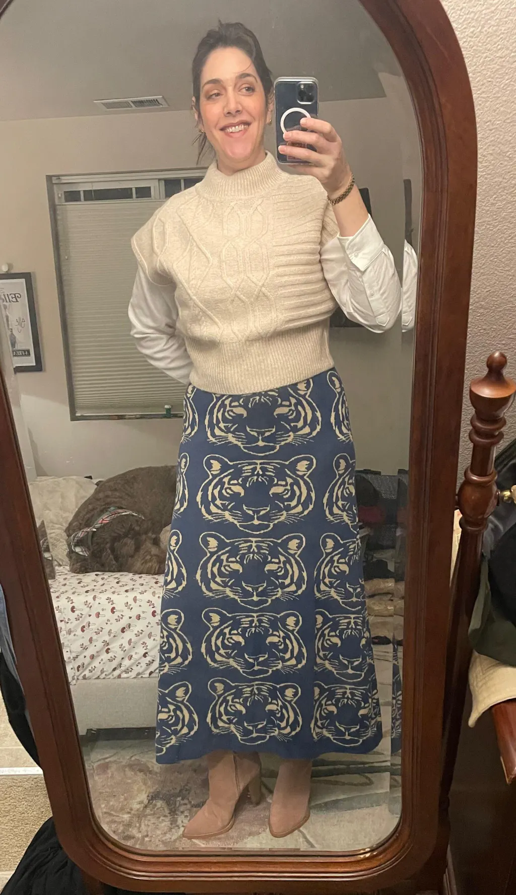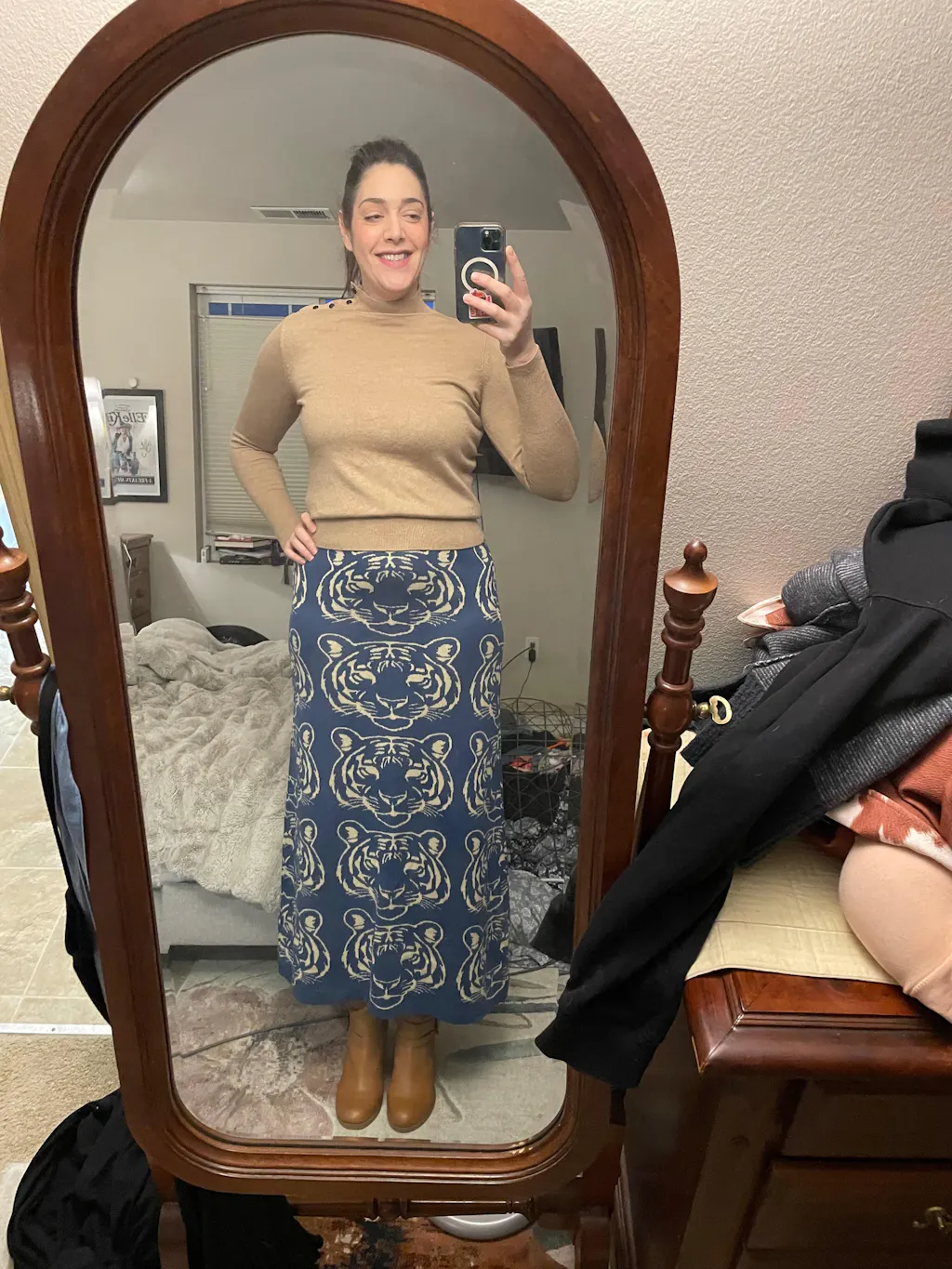 I usually love Oxknit tops and this was my first purchase of a skirt. We'll, I feel a little cat-fished because the tiger pattern looks so weird from the side. The designers should have had one/two faces at the hem and none at the hips. The size is off too as the medium is quite tight. Order a size up if you have curves...