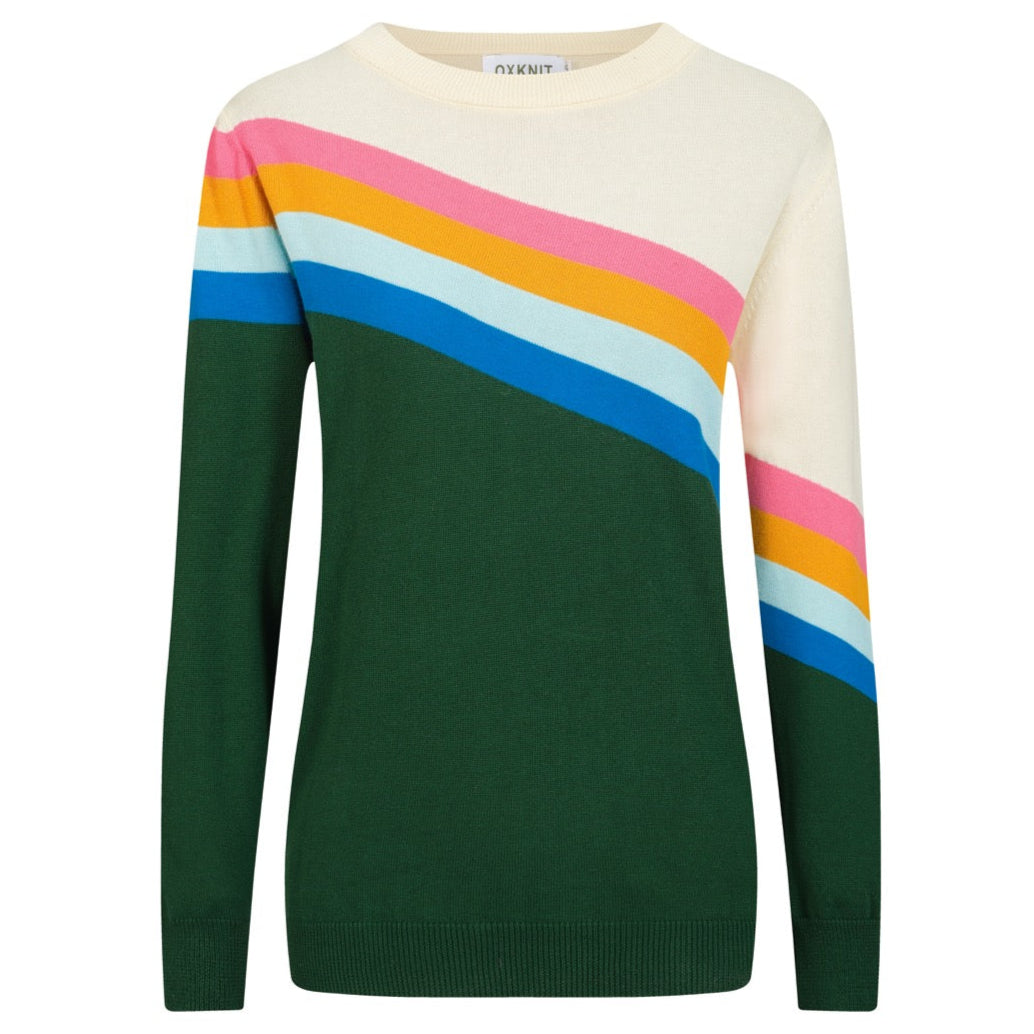 The diagonal stripes don't continue across the sweater as shown on the listing. The stripes are too low on one sleeve; the pink stripe on the sleeve starts below the blue stripe on the body. Aside from that, the sweater is still very nice, and the stripes continue on the back (I hate it when they don't!).