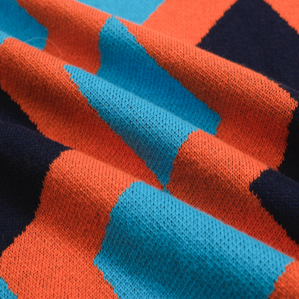 Bringen Sie mit diesem Retro-Strick-Poloshirt für Herren lebendige Vintage-Energie in Ihre Garderobe. Mit seinem markanten geometrischen Muster in leuchtendem Orange, klassischem Blau und Marineblau verkörpert dieses Poloshirt mit Knopfleiste den verspielten Geist und den unverwechselbaren Stil der 1960er und 1970er Jahre. Hergestellt aus bequemem Strickstoff und mit passenden Besätzen versehen, ist es ebenso bequem wie ein Hingucker.