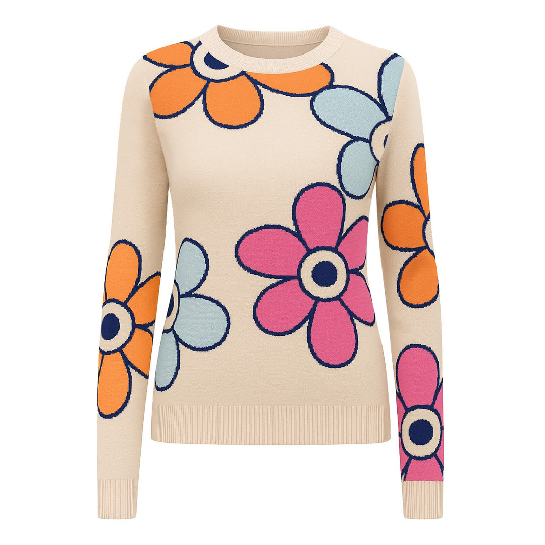 Women Orange Flowers Short Sleeves Brown Knitwear