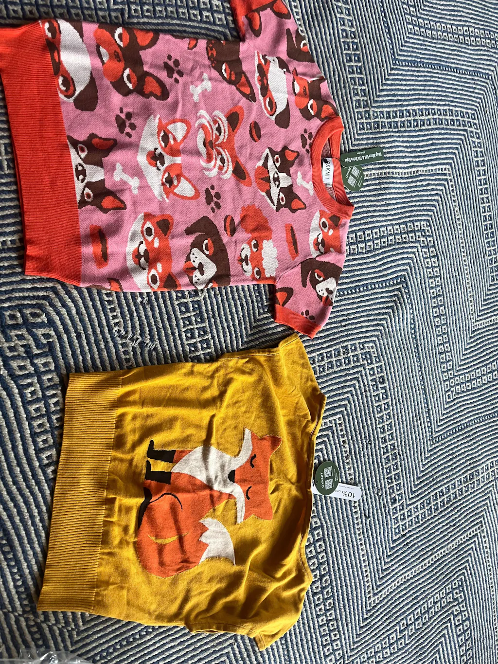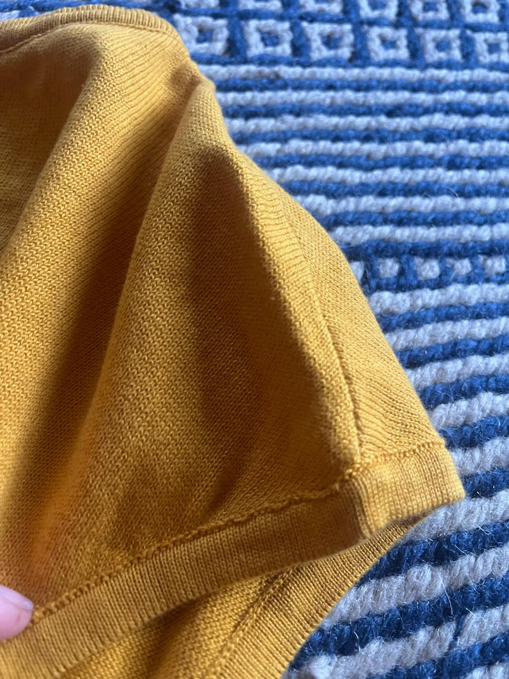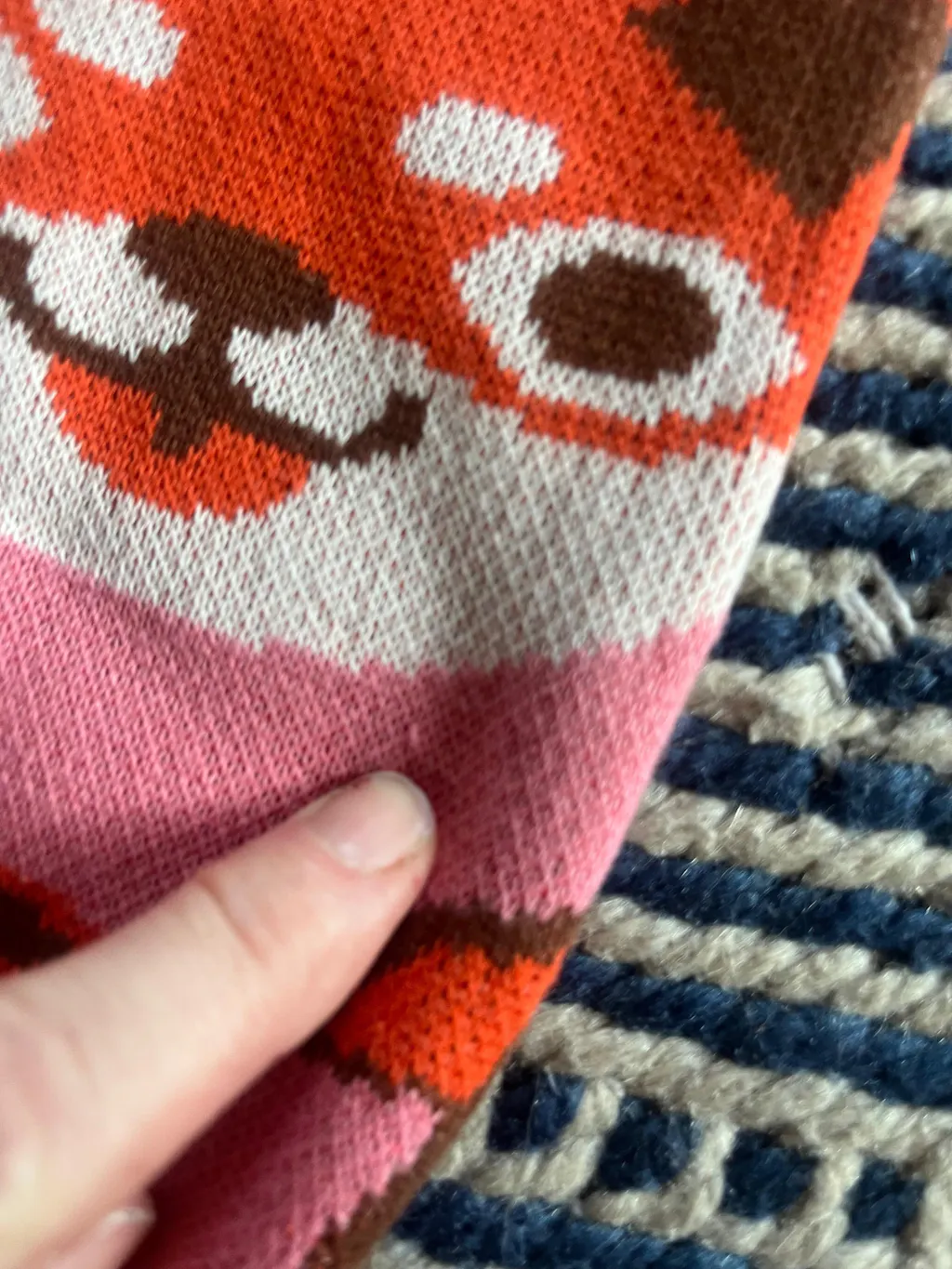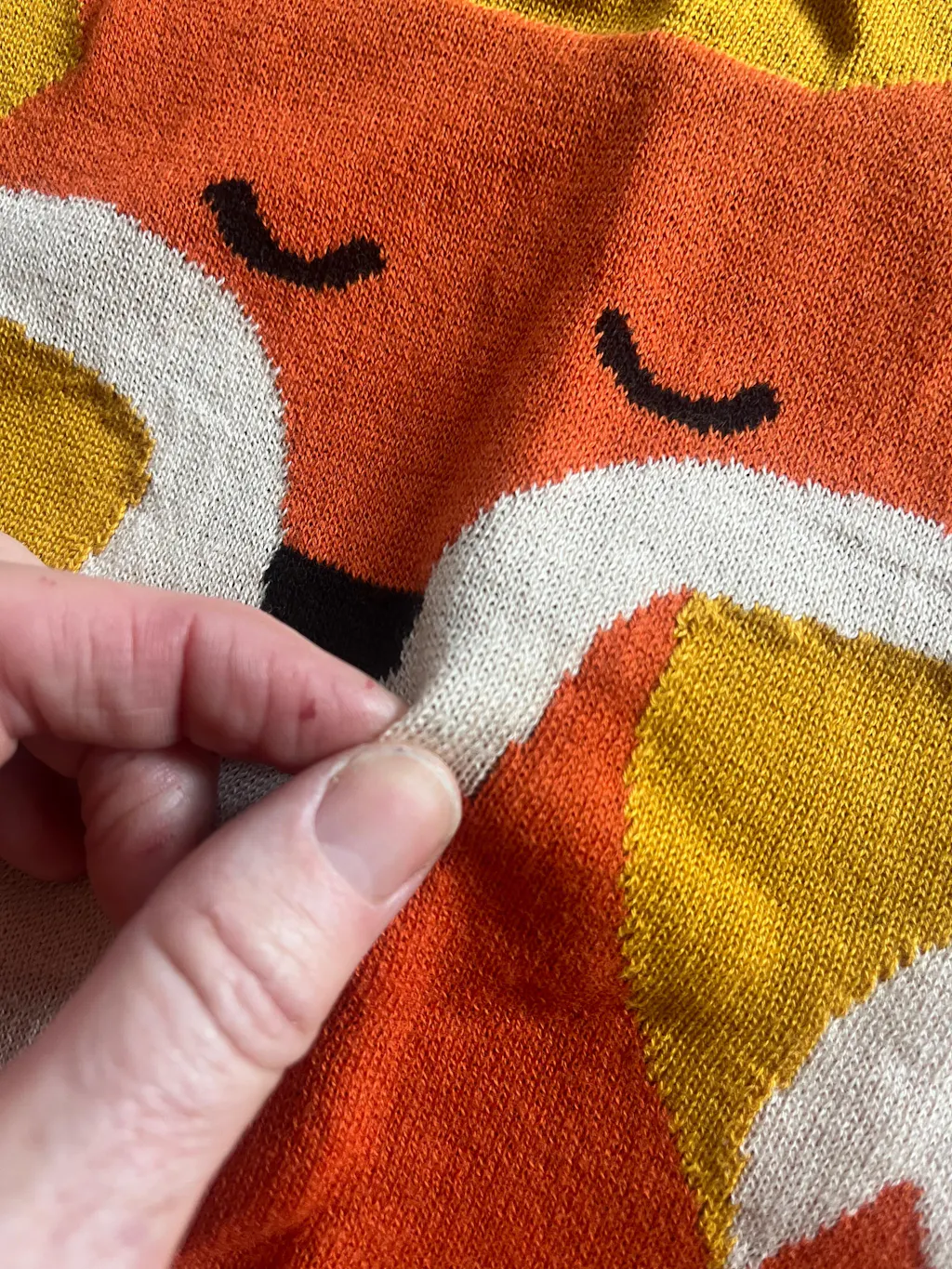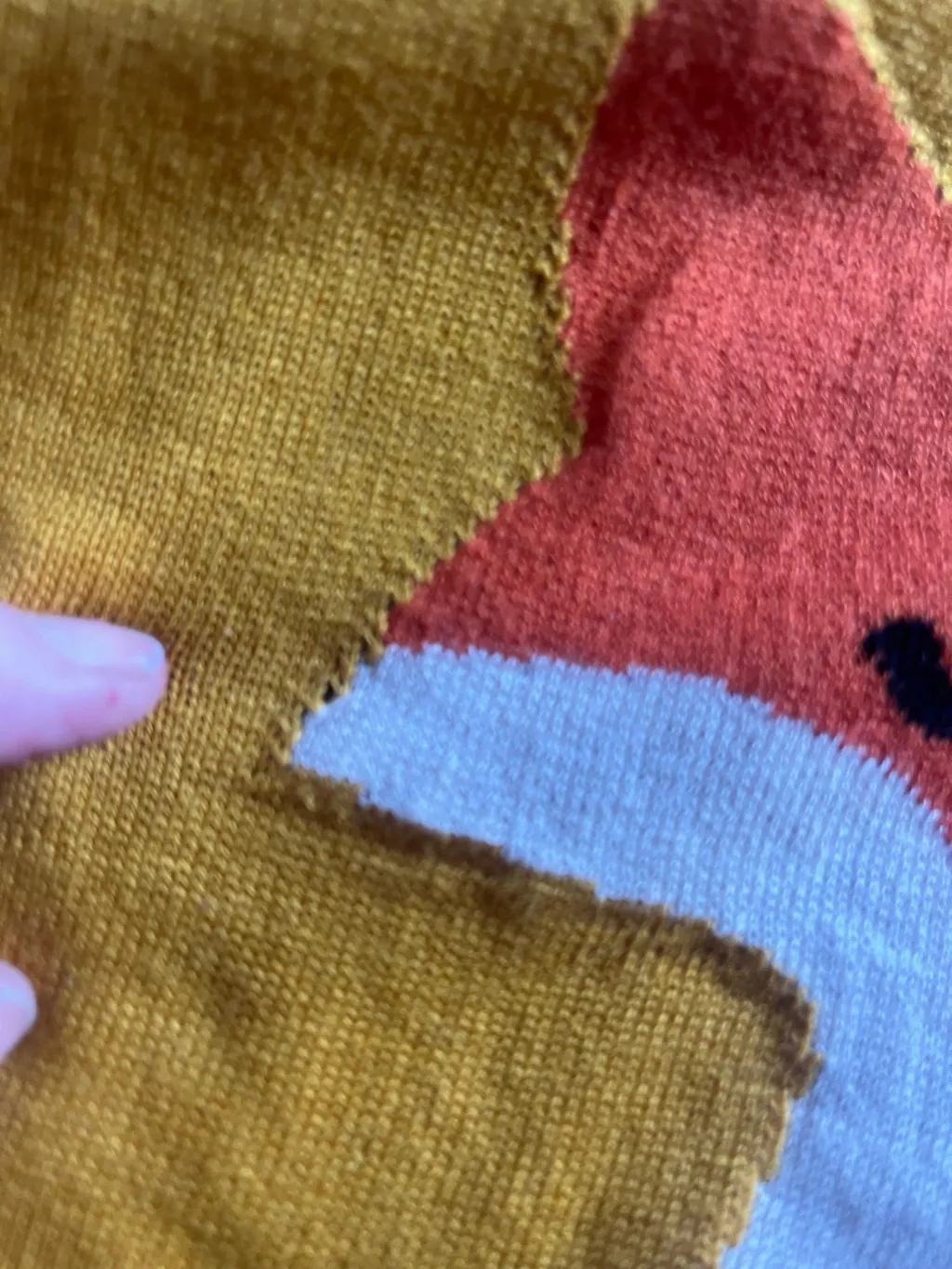 Because this piece is made with jacquard knit, the stitches at curved edges may appear slightly open and the base color may show through, which can look like tiny holes. This is a normal characteristic of jacquard knitting, especially when the fabric is stretched, and does not mean the item is damaged.