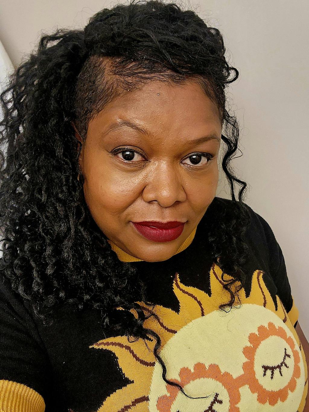 This is such a great sweater. It fits great. The fabric is soft. The design is fun, and it makes me happy.
