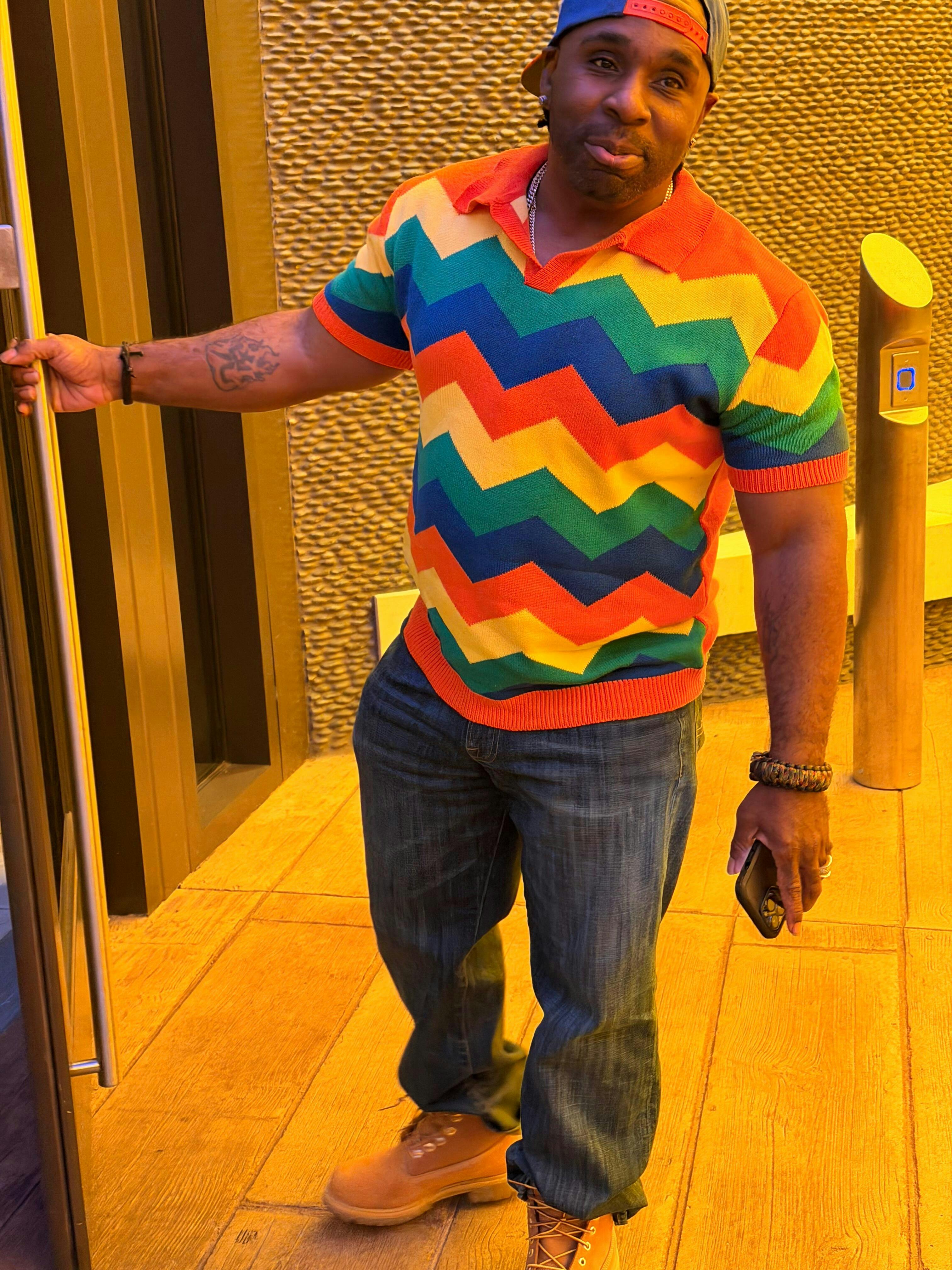 Oranje jacquard vintage gebreid herenpoloshirt met V-hals