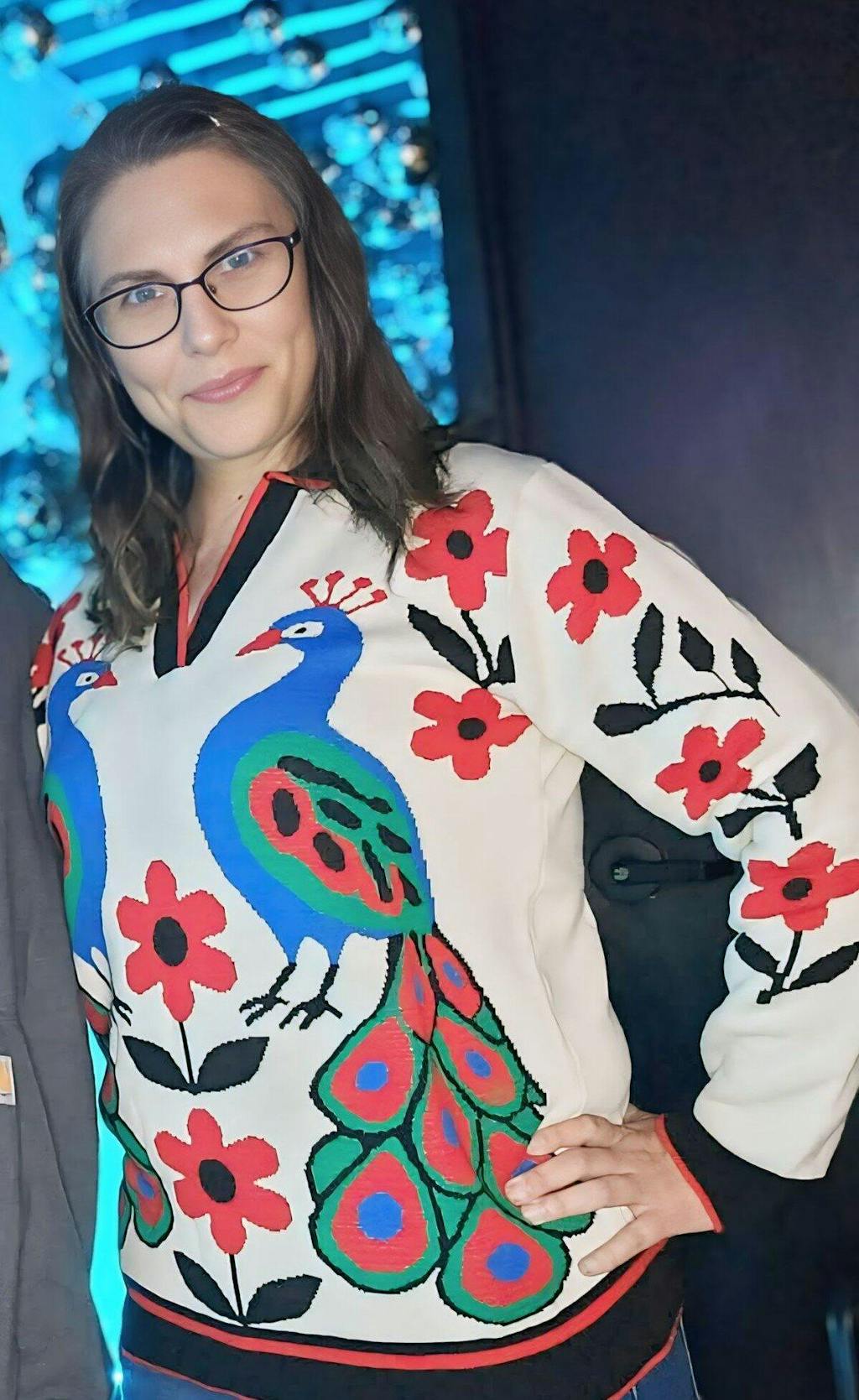I love this sweater! The colours are bright and clear, the fabric is soft and not heavy. I chose this one because it reminded me of the peacock doors at Graceland, and I’m thrilled with it. The v-neck design s so comfortable, too. I got 2xl. Im usually a L-XL sweater in US sizing, and it fits perfectly.