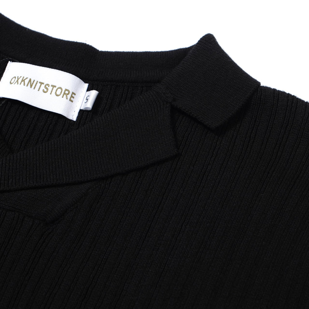 Uma peça essencial atemporal com um toque dos anos 60, esta polo preta de malha apresenta uma textura canelada profunda e uma gola aberta para um visual retrô descolado e despojado. Discreta, porém sofisticada, é o tipo de peça que fala por si só, sem precisar dizer uma palavra.