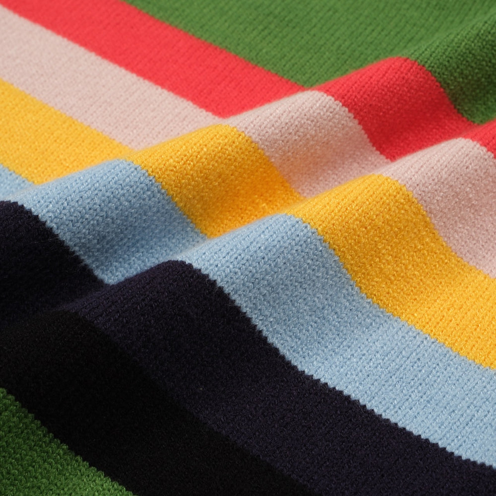 Entre no clima retrô com este suéter masculino saído diretamente dos anos 1970. Em verde-grama vibrante com listras horizontais marcantes em vermelho, rosa-claro, amarelo, azul-celeste e marinho, este suéter traz cores ousadas e energia vintage a qualquer look.