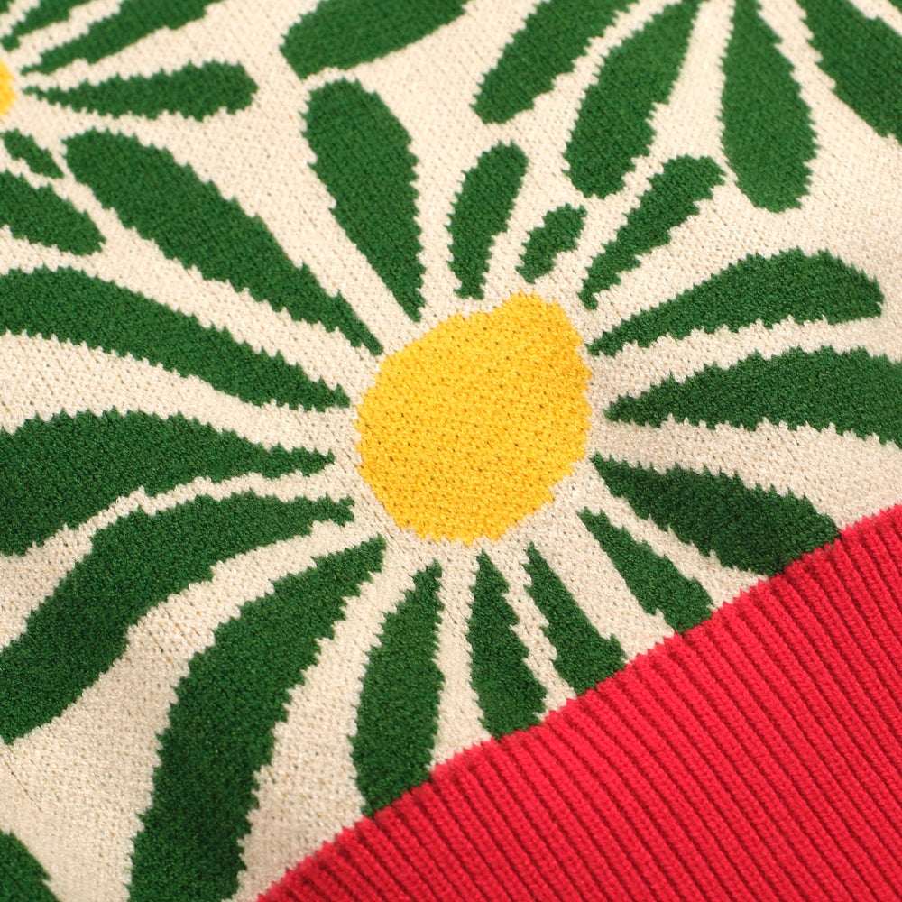 Entre no clima de sol com este suéter vibrante com estampa de margaridas em estilo retrô. O alegre padrão floral se destaca em um fundo creme, com pétalas verdes enormes e centros dourados vibrantes, irradiando o charme dos anos 70.