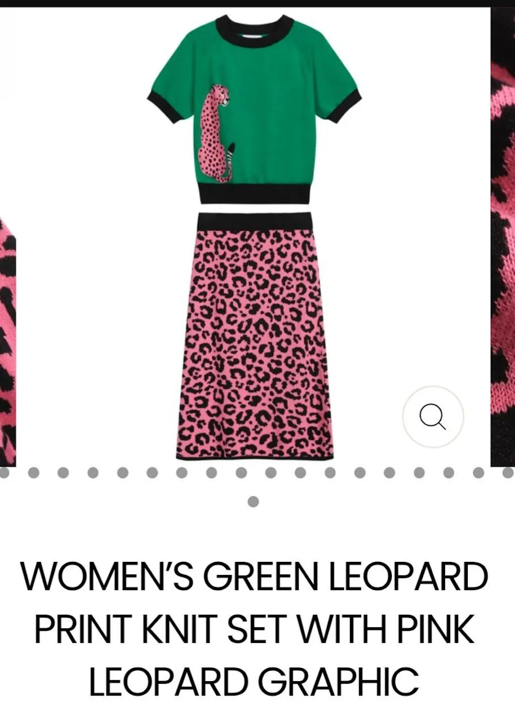 Släpp lös din vilda sida med detta livfulla gröna och rosa leopardmönstrade stickade set. Crop-toppen har en lekfull rosa leopardgrafik mot en djärv grön bakgrund. Pennkjolen speglar det tuffa leopardmönstret och ger en rolig och snygg twist till outfiten. Svarta ribbade kanter fulländar denna eleganta ensemble och säkerställer en smickrande passform och modern känsla.