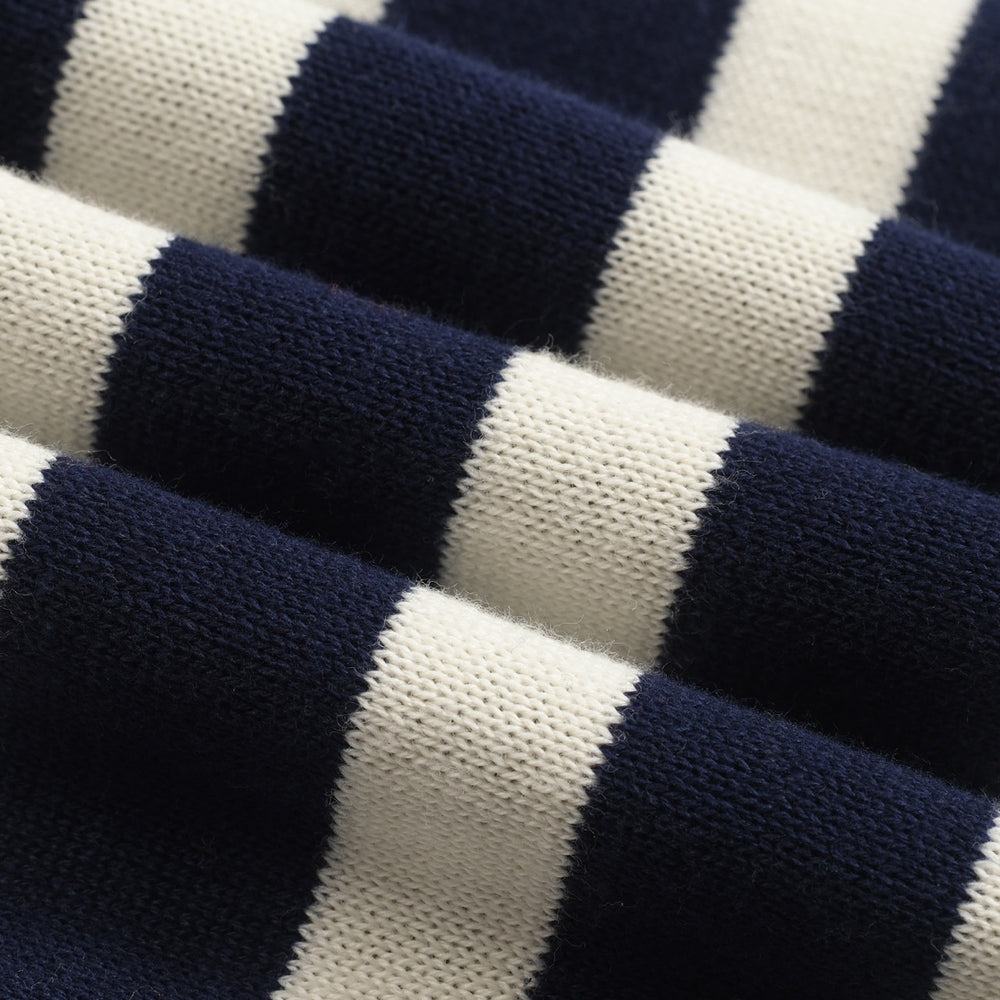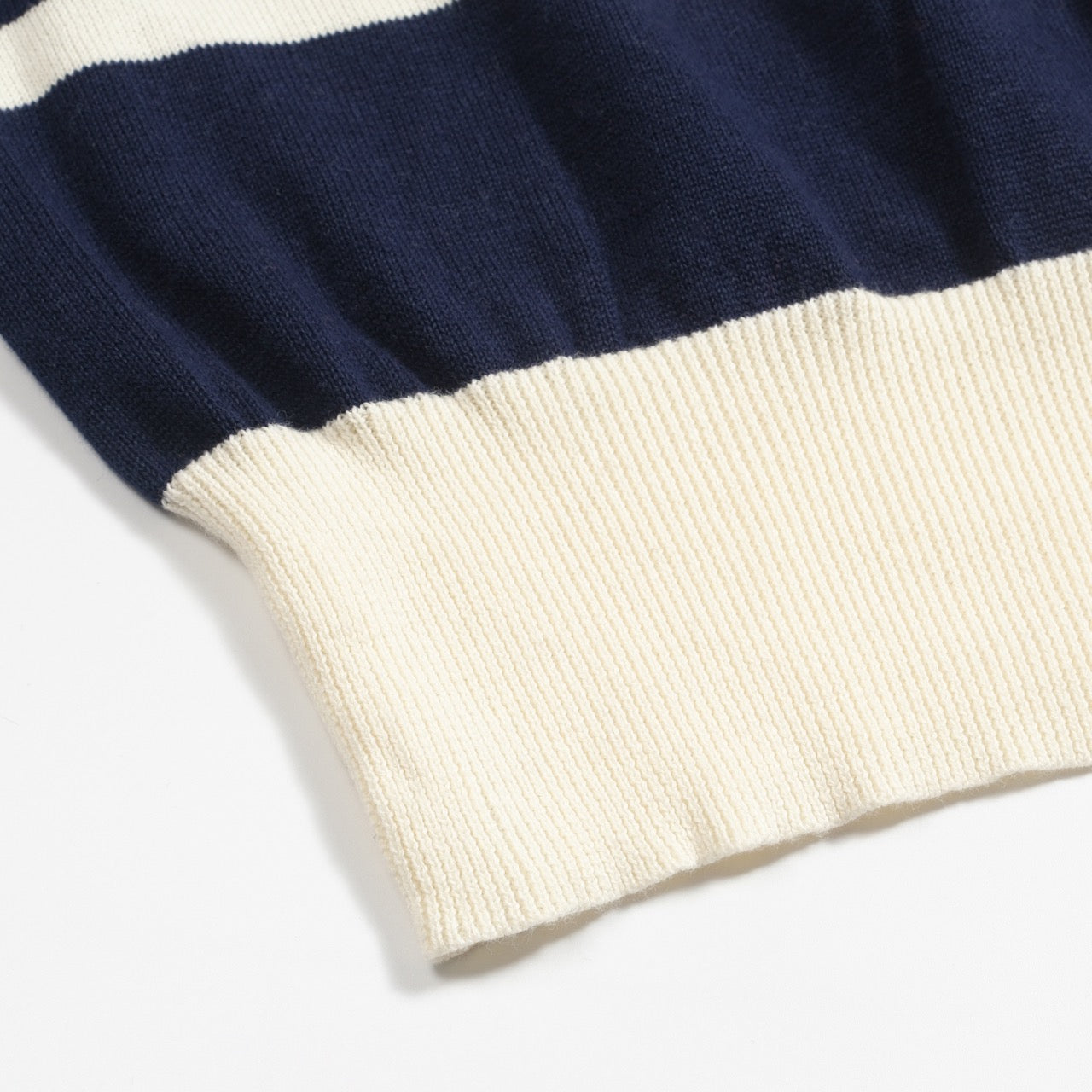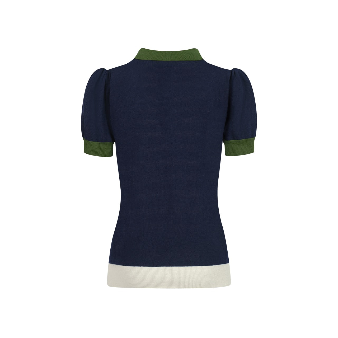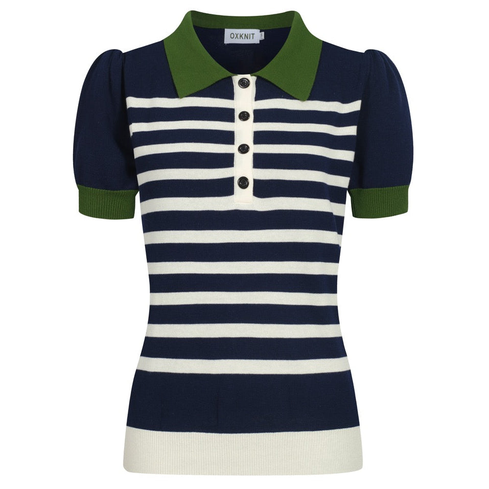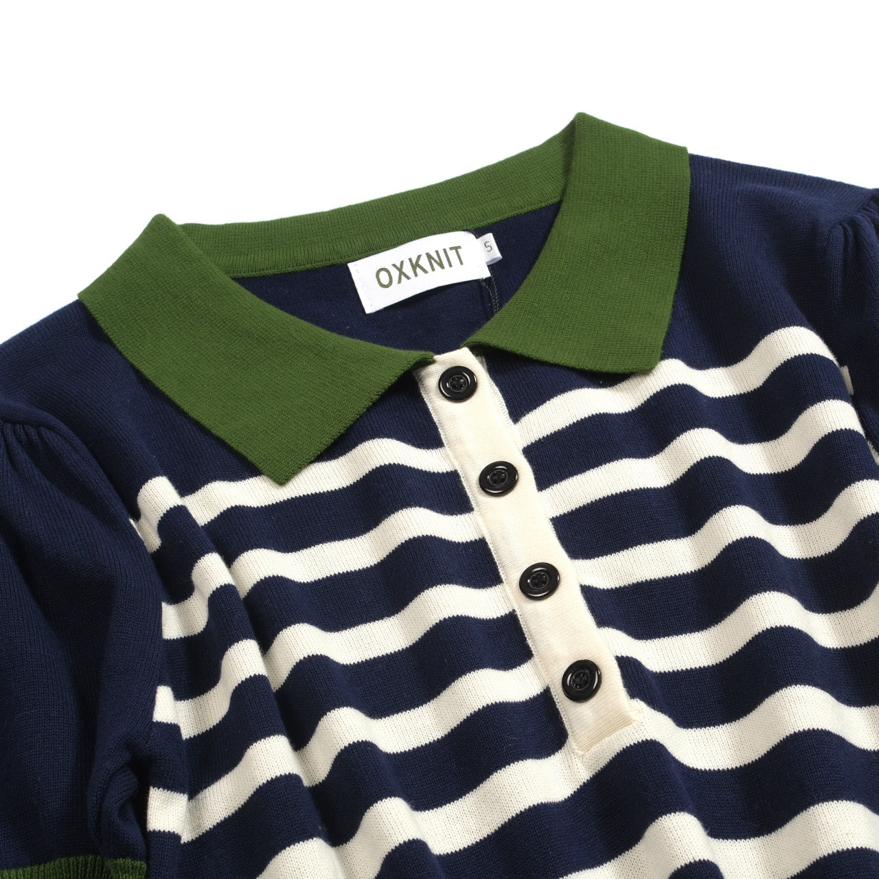 Mörkblårandig stickad puffärmad pikétröja för kvinnor