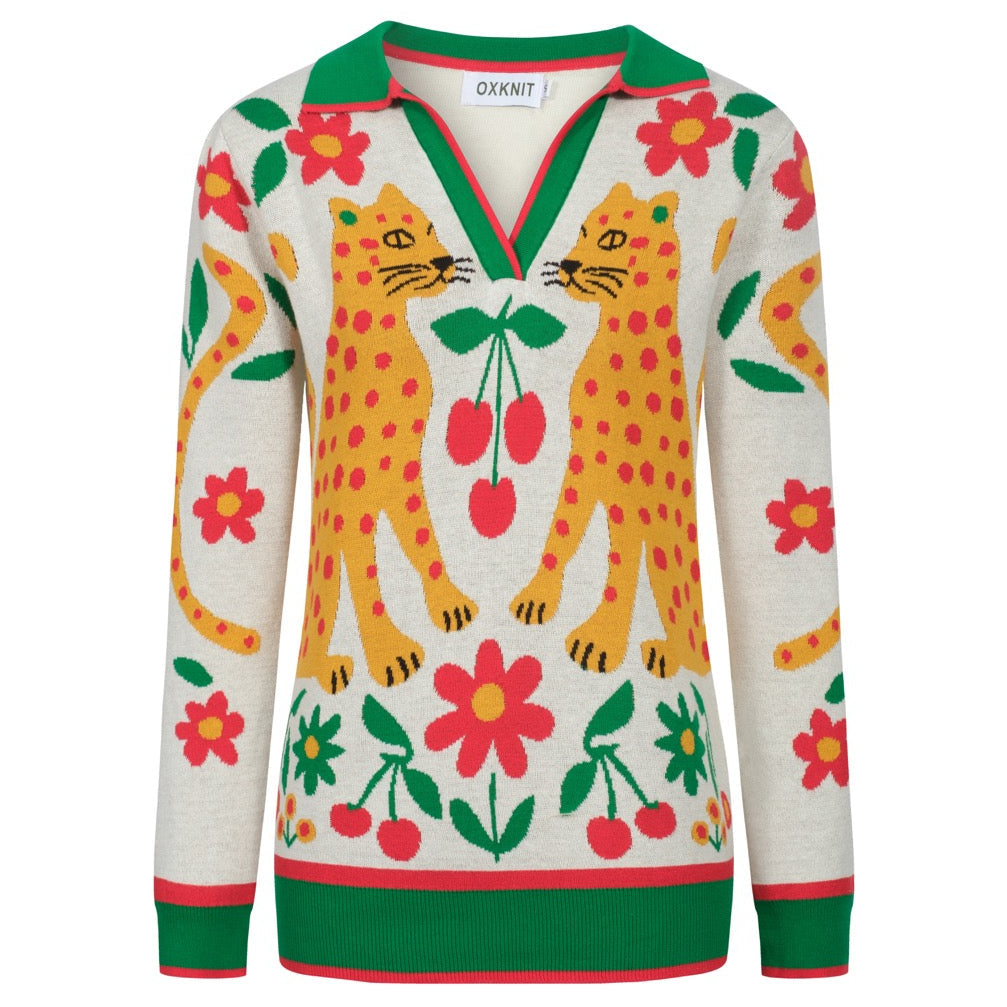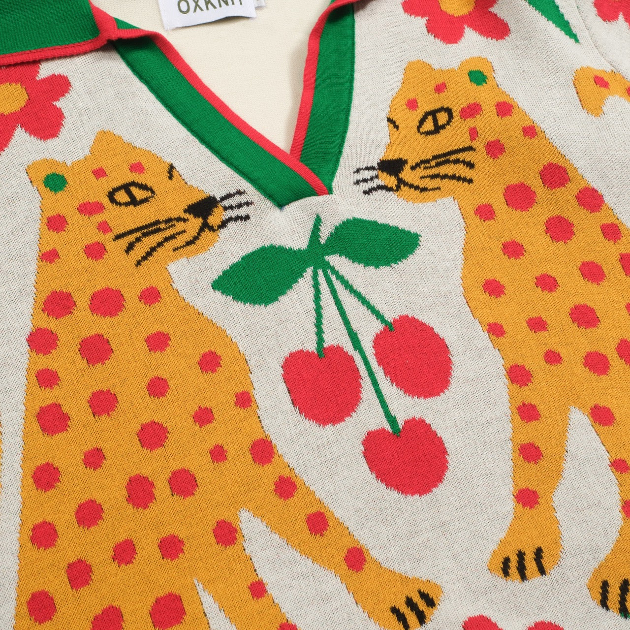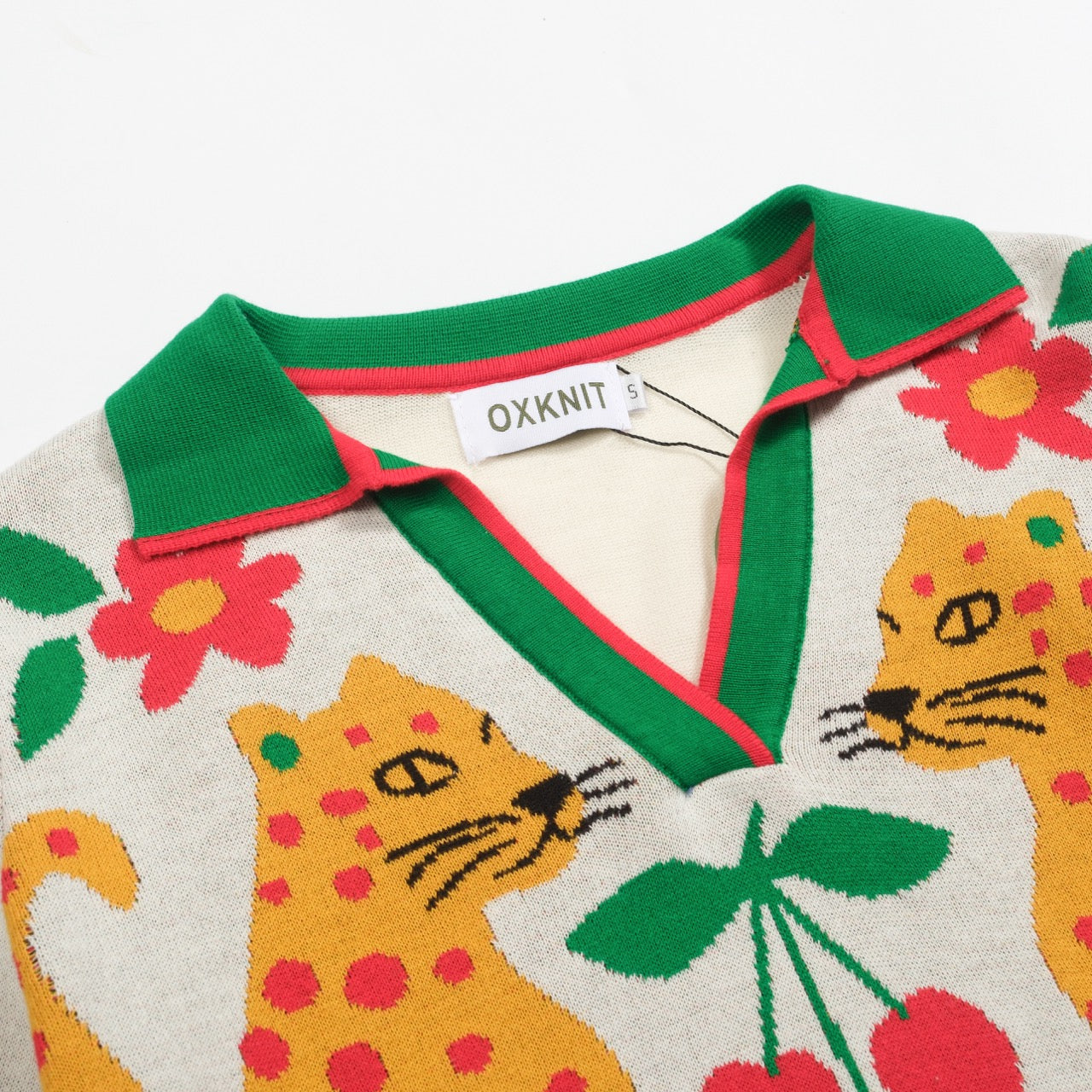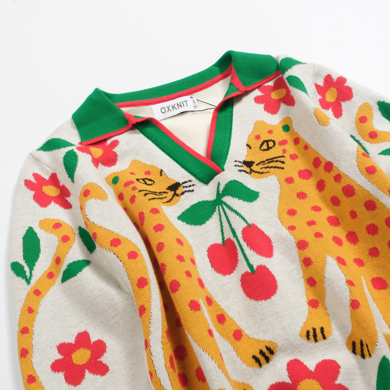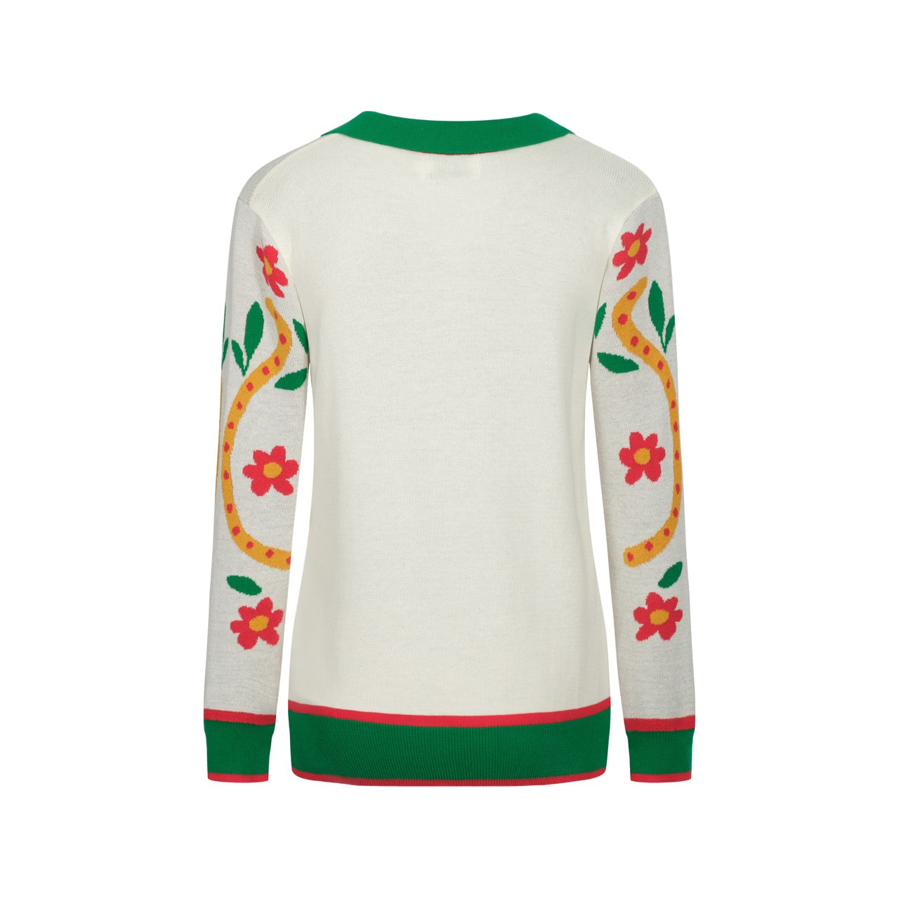 Kvinnors gröna djurblommiga jacquardstickade V-ringade plagg